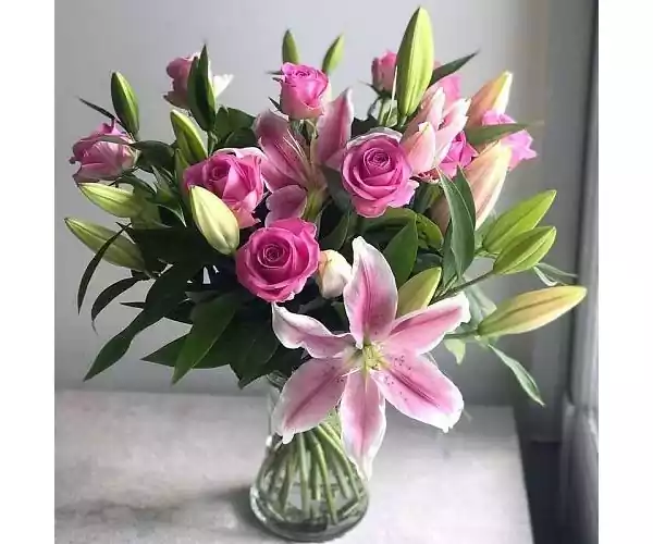 Part of our outstanding romantic flowers range we bring you the stunning Rose and Lily bouquet. The Rose and Lily hand-tied bouquet is an elegant collection of lustrous pink roses intermingled with crisp fresh white lilies, embraced with lush green foliage and encased in luxury florist wrap, using only the freshest and most vibrant flowers this bouquet will help to set the mood for any romantic occasion._x000D_