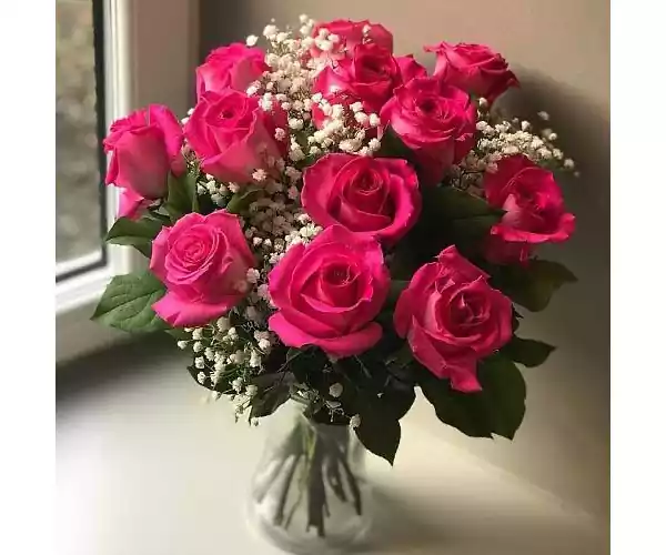 Perfect Pink Roses for your Sweetheart With their connotations of poetic romance and sweetness, pink roses will always be a treasured romantic gift. This bouquet of a Dozen Pink Roses is beautifully created with fresh greenery and white gypsophila too, adding an enhanced element of floral beauty._x000D_