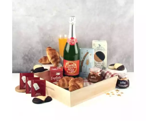 Our Bucks Fizz Celebration Breakfast treat remains one of our most loved hampers. A consistent best-seller, it continues to be popular thanks to its versatility. Whether you're shopping for a Congratulations or Anniversary occasion, it's simply perfect for celebrating! We continually update our classic design with new artisanal food items, and here is our latest take on this favourite gift._x000D_ _x000D_ Beautifully packaged in a trendy breakfast gift tray, you'll find a bottle of the finest Bucks Fizz alongside delicious English Breakfast Tea and Island Bakery Chocolate Lime biscuits. We've included Les Brioches Butter Croissants to be enjoyed with the finest Mrs Bridges marmalade and preserves. With endless flavors to indulge in, we've topped it all off with an exclusively designed Congratulations chocolate gift bar! The keepsake tray allows you to enjoy endless breakfast-in-bed moments long after the celebration has ended._x000D_ _x000D_ Full contents include-_x000D_ Sparkling Chamelle Bucks Fizz - 75cl_x000D_ New English Teas Classic Breakfast Tea - 10 Teabags_x000D_ Island Bakery Chocolate Lime Biscuits - 150g_x000D_ Congratulations Milk Chocolate Bar - 100g_x000D_ Mrs Bridges Celebration Marmalade - 113g_x000D_ Mrs Brides Four Berry Preserve - 113g_x000D_ Les Brioches Butter Croissants x 4_x000D_ Wooden Tray
