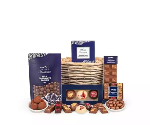 Indulge in a chocolate lover's dream with our spectacular Chocoholic basket, overflowing with decadent creations from the master chocolatiers at Valley Chocolates. We've carefully selected and arranged a variety of scrumptious goodies in a beautiful basket, perfect for any occasion and ideal for sending your very best wishes._x000D_