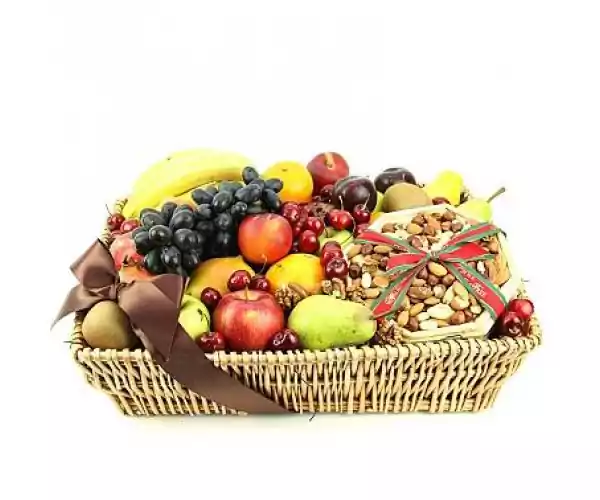 Experience the glamorous collection of fruits with this Gourmet Fruit Basket. This glamorous fruit basket is abundant with fresh and nutritious fruits of various variety which your loved ones would enjoy. The basket also contains a small pack of nuts and dry fruits, all assorted together in a huge cane basket with silky ribbon making it a perfect treat for your loved ones on any special occasion like Christmas, Anniversary, Wedding, Thanksgiving or many more. Send this fabulous Jumbo fruit basket to your loved ones by post to UK with your personal message card attached._x000D_