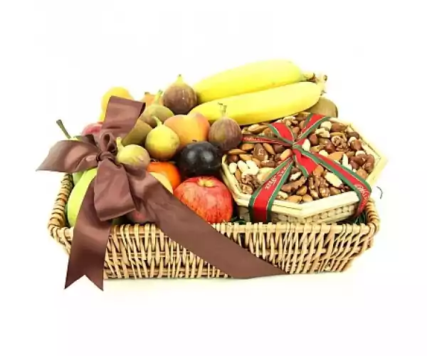 - Get this fanciful Gourmet Fruit 'N' Nut Basket for your family and friends to give them a joyful experience of flavors. This rare combination of Fruits and nuts is a delicious treat where you can experience the rare combination of fruits and nuts. The fruits are assorted with a small nuts bucket all wrapped in a cane basket with silky ribbon. Send this special fruit basket by post to UK with your personal message card attached on any occasion like Anniversary, Congratulations, Birthday, Christmas or Thanksgiving.