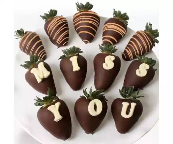 Express your love with a unique chocolate arrangement that says it all! Surprise them with fresh, juicy strawberries that have been dipped in rich chocolate and completed with 'MISS YOU' message.