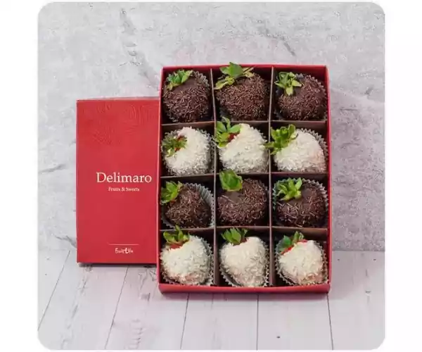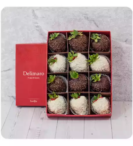 - quality black and white chocolate. The culmination of the exquisite whole are chocolate shavings and aromatic coconut shavings. Each strawberry has been carefully placed in a separate compartment in an elegant box, so it will only melt in the addressee's mouth. Strawberries in chocolate are an aphrodisiac known for hundreds of years, but they will certainly prove to be a gift for any connoisseur of sophisticated sweets and fruit variations.