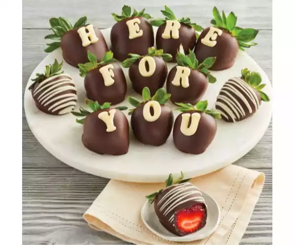 Express your love with a unique chocolate arrangement that says it all! Surprise them with fresh, juicy strawberries that have been dipped in rich chocolate and completed with 'HERE FOR YOU' message.