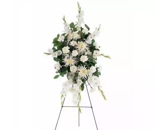 Our Flower Stand "Peacefully" is a respectful way to show condolences and sympathy for a beloved family member, friend, or colleague. A timeless funeral flower stand.