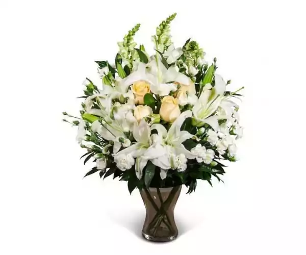 The "I'm with You" vase arrangement is a wonderful and pure way to show you sympathy or condolences. - carefully arranged with lilies and roses, this arrangement is an elegant composition in difficult times.