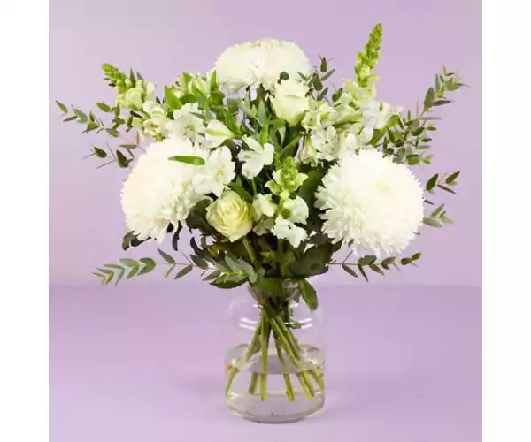 Please note: Chrysnathemum can be toxic to pets if eaten, Alstroemeria can be toxic to pets if eaten, Eucalyptus can be toxic to pets if eaten. Eucalyptus may vary according to availability.:3 x Bloom Chrysnathemum Magnum, 2 x Rose White - Athena / Snowstorm, 3 x Antirrhinum White, 3 x Alstroemeria White, 2 x Eucalyptus Parvifolia.
