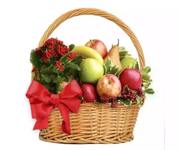 Send your warmest wishes with a delicious and healthy fruit basket! A delectable assortment of fresh fruits and flowers are arranged in a classic wicker basket, and completed with a pretty red bow.
