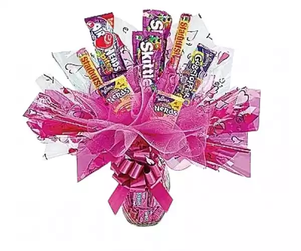 It's time to party and celebrate with this 'Fiesta' Candy Bouquet! Everyone will love these delicious treats! The bouquet is presented in a glass vase filled with Skittles, Starbursts and Nerds Candy. This lovely head