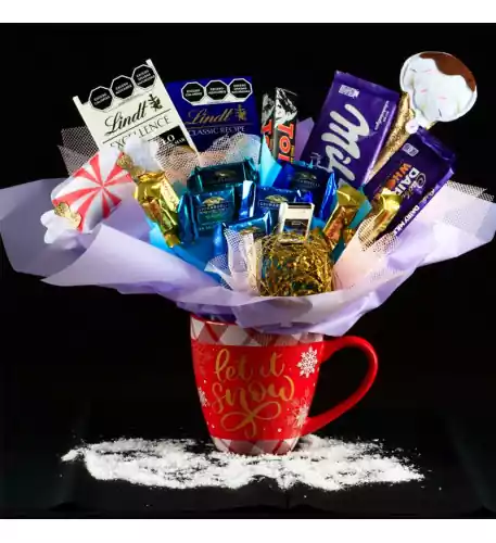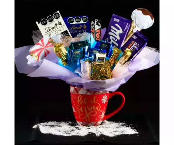 Celebrate the season with a festive "Let it Snow" Candy Bouquet! Presented in a large holiday mug, this sweet gift is paired with 5 large imported chocolate bars (100g) and 10 assorted mini bars. It also includes 2 Christmas ornaments. Perfect for adding warmth and sweetness to the holidays, it’s a delightful treat for chocolate lovers.