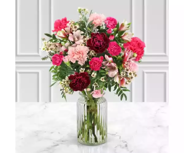 A beautiful collection of Fancy and Spray Carnations in shades of pink and burgundy accompanied by Alstroemeria. Finished with Pistache foliage and delicately complimented by cream Wax Flower._x000D_