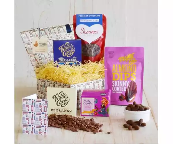 • A smartly presented chocolate hamper with the chocolate gifts carefully handpacked and finished with a hand