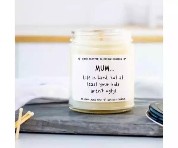 This candle is sure to make mum's heart melt with its cute quote, MUM... Life is hard, but at least your kids aren't ugly!