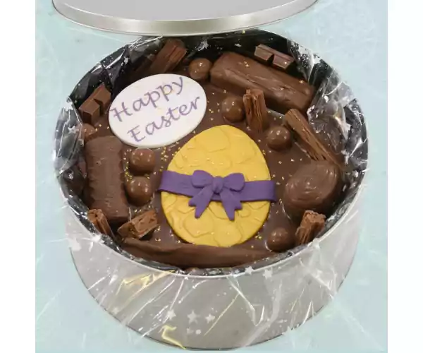 A delicious Easter cake in a tin. With various assorted chocolate confectionery favourites including a sugar crafted golden egg and purple bow. Kept deliciously fresh and safely delivered in a gift wrapped tin