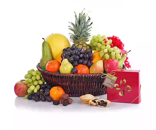 Keep the festive period healthy with this selection of fresh seasonal fruit such as Pineapple, Grapes, Pear, Oranges, Plum, Kiwi, Green Apples, Red Apples, Satsumas and to finish off a fine selection of 6 Mince Pies and a large box of Chocolates.