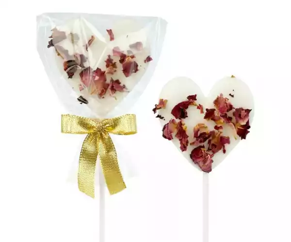 White Heart-Shaped Lollipops with Rose Petals – Order Online Now and Sweeten Your Special Moments! Want to add a sweet and stylish surprise to your special occasion? Our white heart-shaped lollipops with rose petals are just the thing! The set includes 10 elegant lollipops in a romantic heart shape, lovingly decorated with delicate rose petals. These lollipops are not only a treat for the taste buds but also a real eye-catcher at any celebration. Whether as a party favor, a highlight on the dessert table, or a little something special – they are perfect for weddings, birthdays, Valentine's Day, or Mother's Day and will bring a smile to the faces of your loved ones. The heart-shaped lollipops combine delicious taste with elegant design and, thanks to their handy size, are particularly practical for handing out, giving as gifts, or enjoying yourself. They add a touch of sophistication to any celebration and are a sweet symbol of love and affection. Order online now and round off your special moments with a charming and indulgent idea!