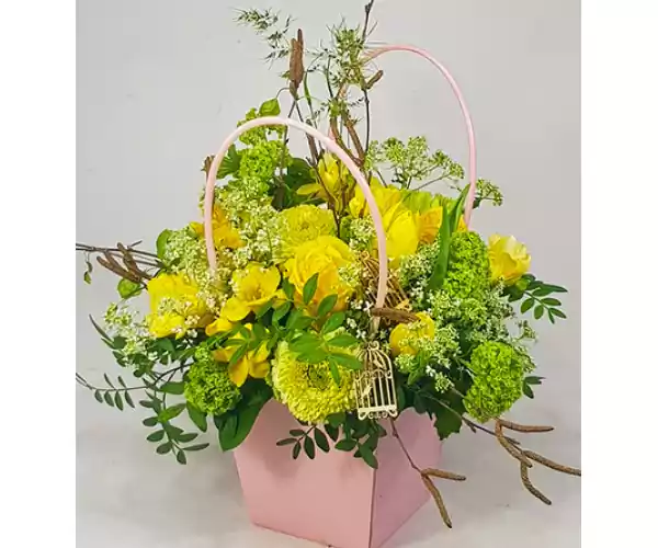 Summer colors, extravagant and natural shape! Yellow roses, fragrant freesias, alstroemeria, yellow flowers and lots of branchy accessories create a spectacular composition. Vibrant, fresh, lively and energetic, like the mother who is the engine of a true "Szeleburd family"... Of course, it can also be an excellent gift for a summer birthday after Mother's Day. The color of the holder can be changed according to the occasion and your message... This composition can be ordered in 4 different colors and flower arrangements. Our Mother's Day novelties on our Facebook page The holder shown in the picture can only be sent to Budapest and its surrounding area!