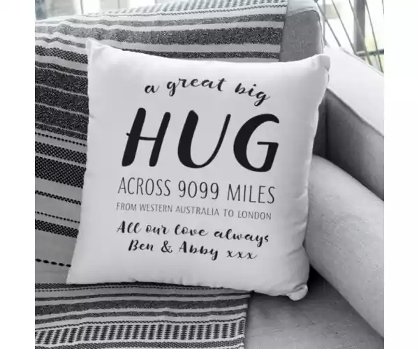 Are you searching for a thoughtful gesture to send to a distant friend or loved one? Need a way of reminding someone you can't see in person that you're always thinking of them? We have the perfect gift for you! Our 'Hug Across the Miles' huggable cushion is an affordable designed to give someone special a great big hug from you wherever you are! It is a thoughtful gift guaranteed to bring a great big smile too._x000D_