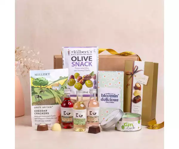 Delight any gin lover with our Triple Taste Gin Celebration Hamper, a thoughtfully curated selection of gin-infused treats and gourmet snacks, perfect for celebrating in style. This beautiful gift box is packed with premium gins and indulgent goodies, making it a truly memorable experience for any special occasion._x000D_ _x000D_ At the heart of this hamper is a Triple Bottle Gin Selection, featuring three delicious and distinctive flavors:Raspberry Gin for a sweet, fruity twist,_x000D_ Elderflower Gin with refreshing floral notes,_x000D_ Rhubarb & Ginger Gin for a tangy and warming finish._x000D_ Each bottle offers a unique taste, perfect for mixing or sipping on its own._x000D_ _x000D_ Enhance the experience with a Gin O'Clock Gin & Tonic Scented Candle, designed to fill the room with the refreshing aroma of a classic gin and tonic, creating the perfect atmosphere for unwinding and enjoying a drink._x000D_ _x000D_ For a touch of sweetness, we've included a Bloomin' Delicious Milk Chocolate Bar, a fun and tasty treat that pairs perfectly with a glass of gin. Indulge further with Hamlet's Belgian Assorted Pralines, offering rich and smooth chocolate delights for the ultimate treat._x000D_ _x000D_ For savoury snacking, enjoy Filbert's Olive Snack Pack, a gourmet olive selection, and Miller's Cheddar Crackers, which make for the perfect accompaniment to a gin tasting session._x000D_ _x000D_ All these delightful items come beautifully packed in a high-quality gift box, finished with a complimentary themed ribbon to complete the luxurious presentation. Whether for a birthday, celebration, or just because, this Luxury Gin Hamper is the perfect way to toast to any special moment!