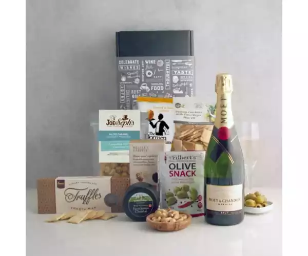 Our Moet Chandon and Gourmet Delights Hamper is the perfect gift solution for a very special occasion such as an Anniversary Celebration or to a wedding couple. It's very popular to send direct to the newly married couple's hotel room or to a couple celebrating a special engagement. It's also a great gift for a birthday, tied with Happy Birthday ribbon. Full contents of this hamper are -_x000D_
