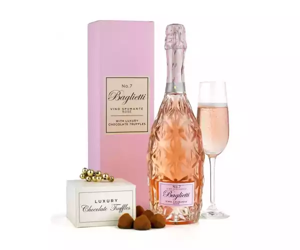 - Treat that special lady in your life with this gorgeous pink Prosecco and chocolates gift set. With a full size bottle of sparkling rosé wine and a box of decadent french chocolate truffles, this gift is sure to put a smile on her face.