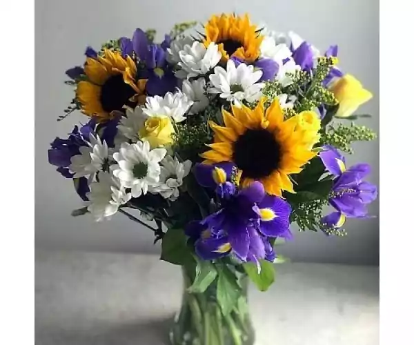Our Purple Daze bouquet is a fitting arrangement to bring those lovely smells of the blooming crisp blue iris, Sunflowers, Roses and white chrysanthemums this beautiful bouquet setting the scenes of Spring will look and smell amazing will be ideal to send to someone who loves visual pleasures.
