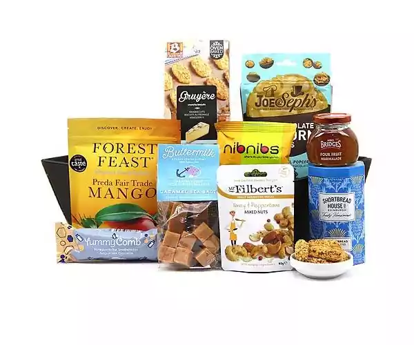 A combination of decadent tropical dried fruit & roasted mixed nut selection along with milk chocolate popcorn bites, caramel and seasalt fudge and more this hamper is sure to delight any food enthusiast.._x000D_