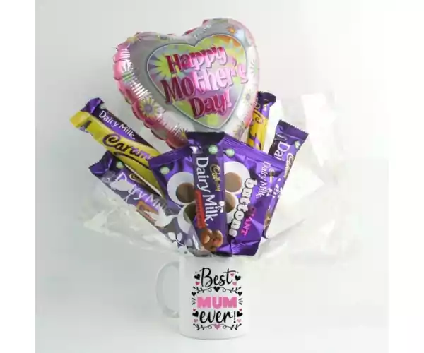 Perfect treat to wish Mum a Happy Mother's Day! This Dairy Milk Chocolate Mug Bouquet is filled with popular chocolate bars and arrives complete with a lovely floral 'Happy Mother's Day' balloon.