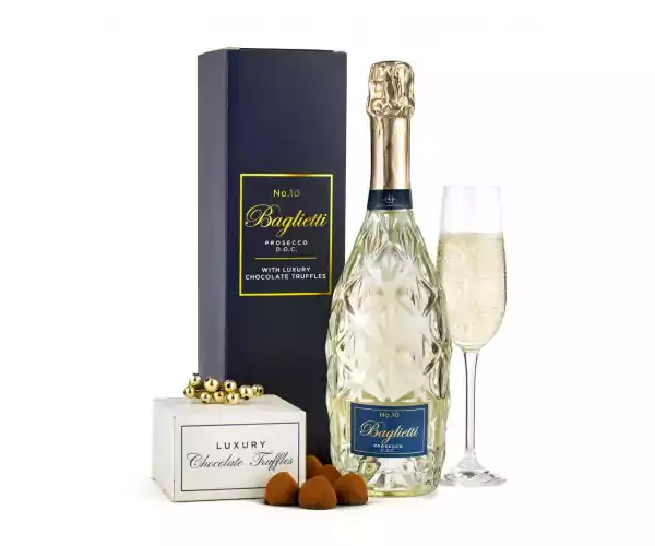 • The beautifully presented Baglietti Prosecco No.10 boasts a large scent and an elegant dry taste of pears, citrus, and almonds. Its full flavour comes from grapes, carefully selected from the Piave area of Italy, and the process of allowing the wine to rest on yeast. Perfectly partnered with the rich, Classic French Chocolate Truffles, the ideal serving temperature of this Prosecco is 6